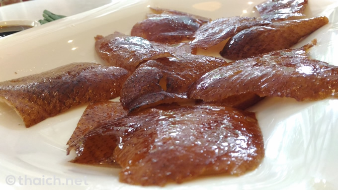 「北京ダッグ」では皮の部分しか食べませんが、お肉の部分は別途オーダー可能。こちらは「アヒル揚げの黒豆添え」です。「北京ダッグ」の値段350バーツに含まれているようですね。