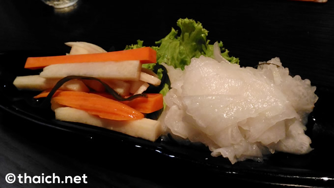 この日オーダーしたのは、既に食事を終えていたこともあって、お酒を飲みながらつまめるもの。「お漬物盛り合わせ」はボトルを頼むとサービスされる料理の中の1つです。