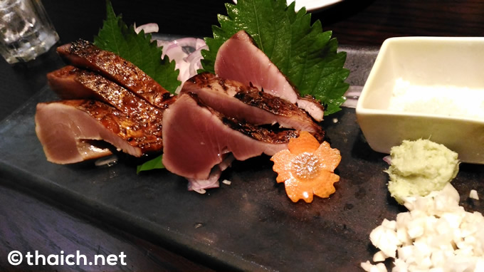 「ほっこり」では藁で炙って旨味を閉じ込めるという“藁焼き”を注文しないと始まりませんね。「鰹の塩のたたき」(390バーツ)。
