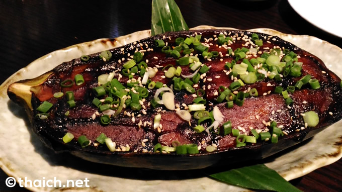こちらは「茄子の味噌田楽」(150バーツ)。手の平くらいの大きさはある大きな茄子です。