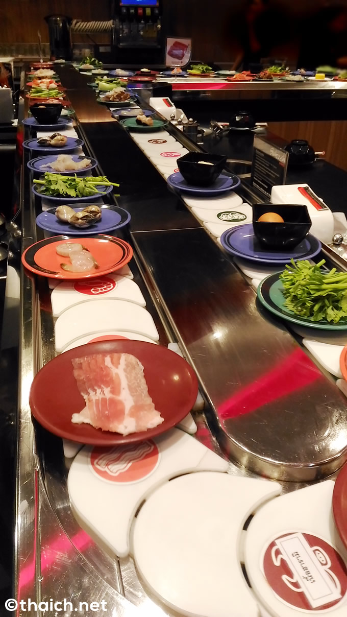 なんと言っても「シャブシ」の売りは、日本の回転寿司スタイルであること。ただし回っているのは寿司でなく、タイスキの具材です。肉に魚介に野菜など。