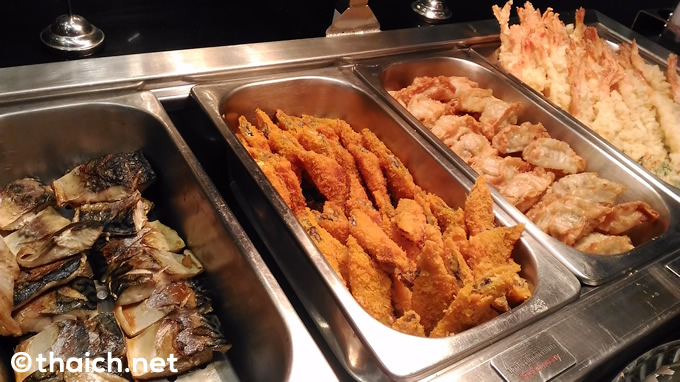 お寿司は回転していないので、取りに行きます。種類はそれほど多くなく、メインはサーモンの寿司でしょうか。以前あったイカは最近なくなってしまいましたね。タイ人はたっぷりとカニカマを取る人がおおいですね。