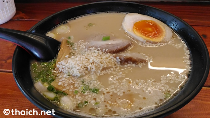 メニューは豚骨ラーメン1つで、普通盛りが80バーツ。チャーシュー、卵、メンマ、ネギ、ゴマの乗っていて、テーブルには紅しょうがも置いてあります。本格的ですね。マナオ(ライム)が置いてあるのはタイ風ですね。