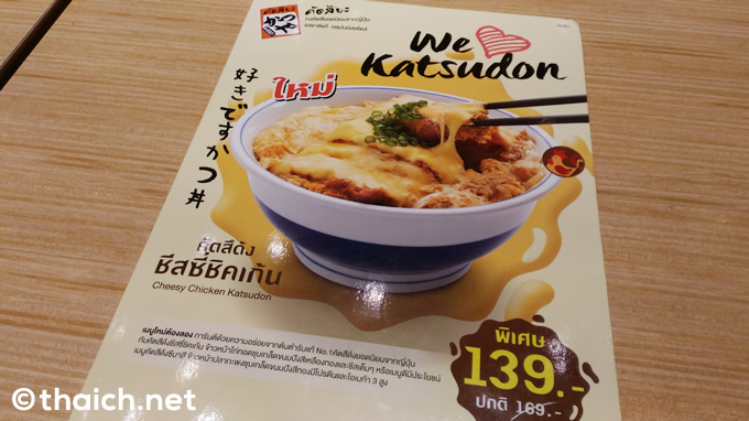 今回オーダーしたのは、店頭に大きなポスターを張って絶讃PR中の、新メニューである「チーズチキンかつ丼」。通常価格169バーツのところ、現在特別価格139バーツで提供中です。