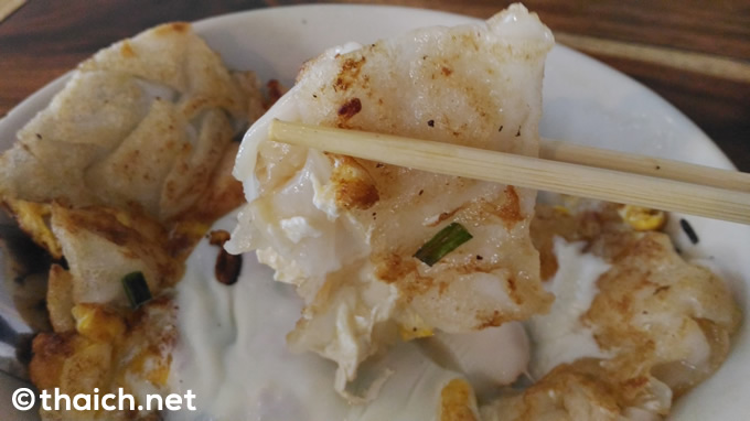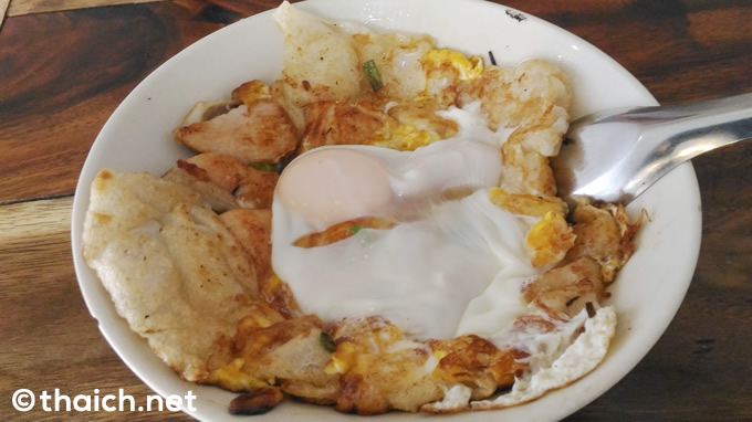 このお店で必ず食べたいのが、米粉製の極太麺をフライパンで焼いた「クワイティアオクアガイ(ก๋วยเตี๋ยวคั่วไก่)」(60バーツ)。下の写真は卵が入ってプラス10バーツですね。