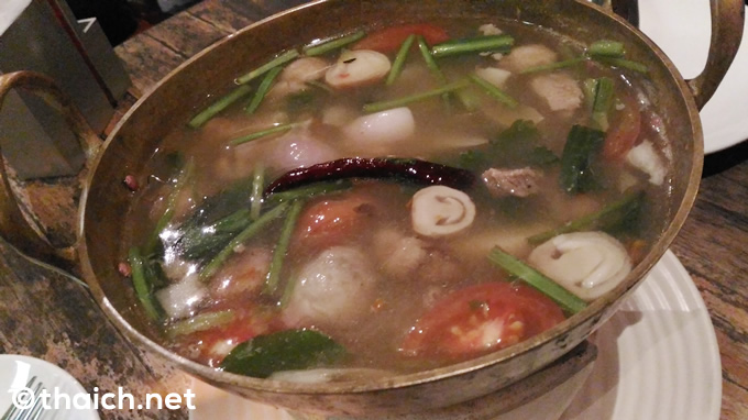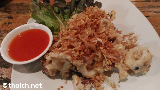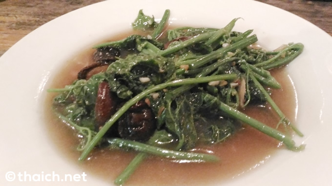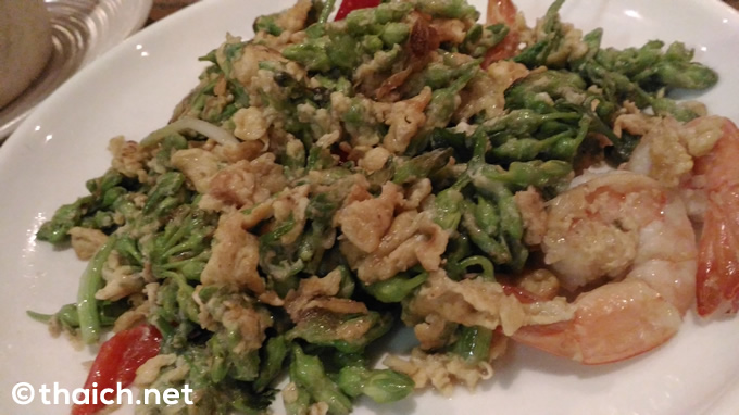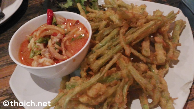 もちろん普通のタイ料理も充実。こちらは「ヤムパクブンクロープ(ยำผักบุ้งกรอบ)」(140バーツ)。これ絶品で空芯菜の天ぷらと言ったところでしょうか。