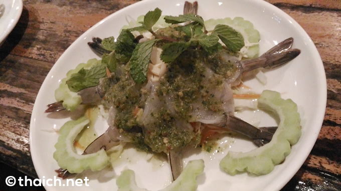 例えばこちら。よくあるタイ式エビの刺し身「クンチェーナンプラー」ですが、ここのはわさびの風味が加わった「クンチェーナンプラーわさび(กุ้งแช่น้ำปลาวาซาบิ)」(180バーツ)です。なかなか珍しいですね。