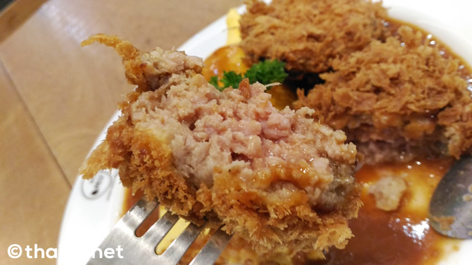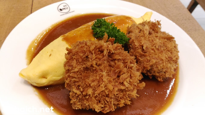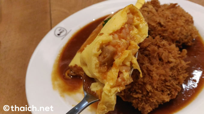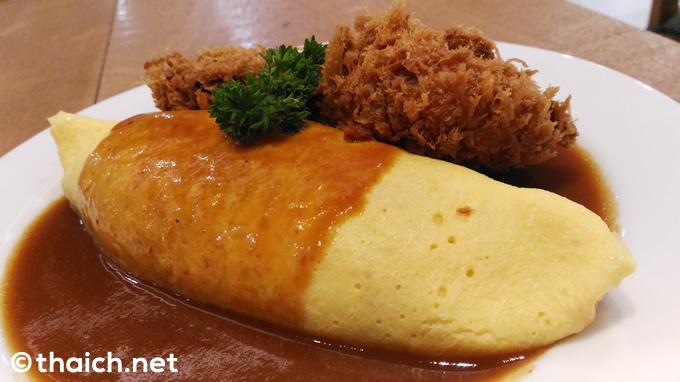 大根おろしの日本風ソースや、トマトソース、デミグラスソース、ドリアスタイルと色々なオムライスがありますが、今回オーダーしたのは230バーツの「自家製黒豚メンチカツのデミグラスソースオムライス」。25バーツのお水と合わせて会計は税、サービス料込み270バーツでした。