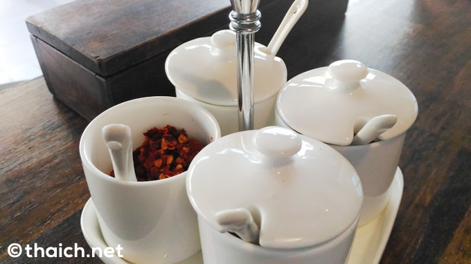 トムヤムヌードルというのは、辛くて酸っぱくて甘いトムヤムスープのヌードルのこと。テーブルに用意してあるナンプラー、唐辛子、砂糖、酢で自分好みの味に調節できます。
