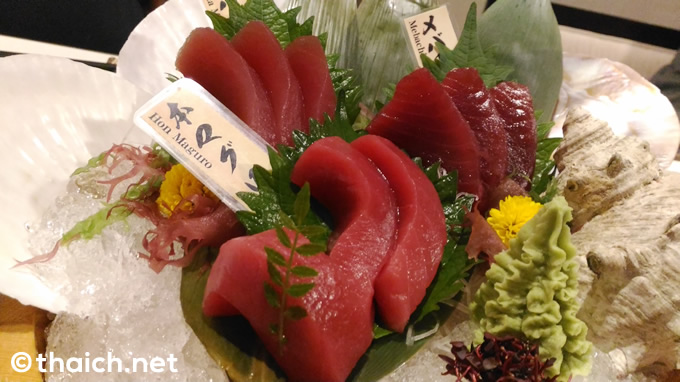 「庵寺」でかならずオーダーしたいのが、日本直送だというマグロですね。こちらは「赤身3種食べ比べ盛り」(540バーツ)。本マグロとキハダマグロとメバチマグロを食べ比べましょう!