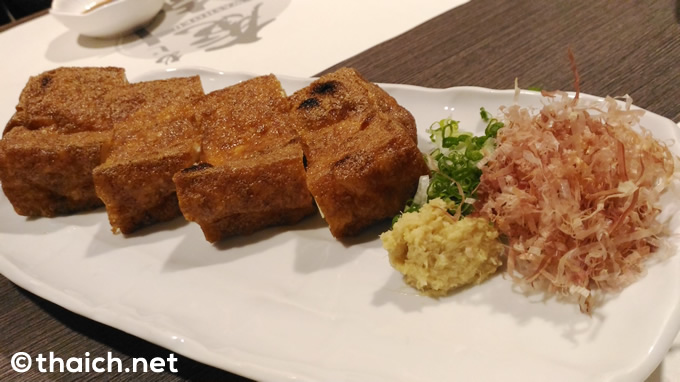 こちらは焼き立て熱々の「厚揚げ焼き」(140バーツ)。