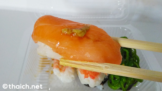 ということで買ってみました。4つで20バーツ。お箸と醤油とワサビが付いてきます。