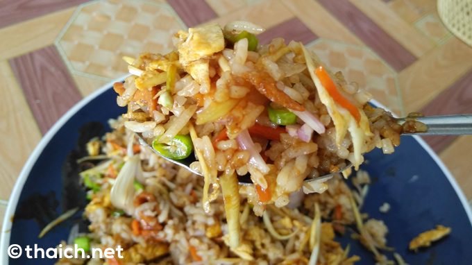 ガピという小エビ塩漬けペーストで炒めたご飯に、パパイヤの千切りや唐辛子やお肉など、様々な具材がはいった「カオクルックガピ」。食堂で見かけたら是非お試しを。とっても美味しいですよ!