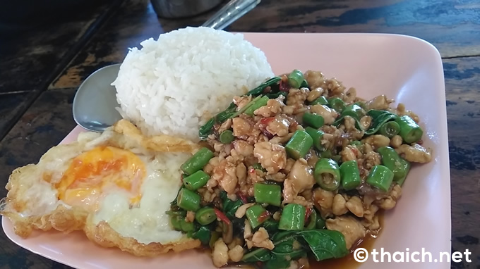 今回オーダーしたのは「豚肉バジル炒めごはん」。日本ではガパオライスと呼ばれています。目玉焼きがついて価格は50バーツと、都心なのに懐に優しいローカル価格なのがうれしいですね。