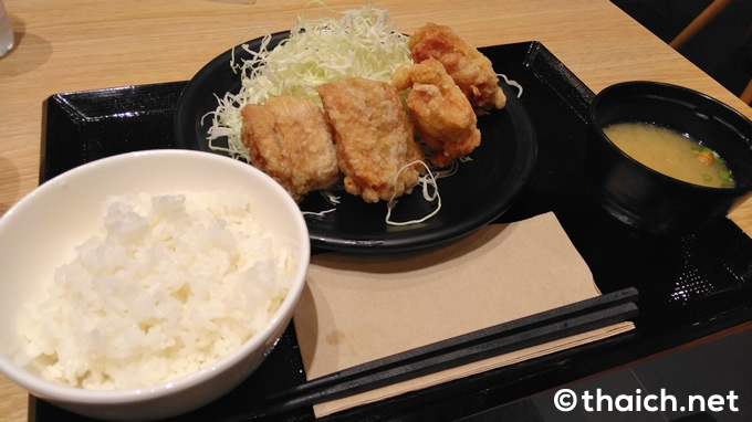 サイアムスクエアワンに行った際に、オープニングプロモーションのビラをもらったので早速訪店。定食全品149バーツのプロモーションで、通常169バーツの「からやま定食」をオーダーしました。「からやま定食」はからあげ4個に、ご飯、みそ汁、千切りキャベツ付きです。
