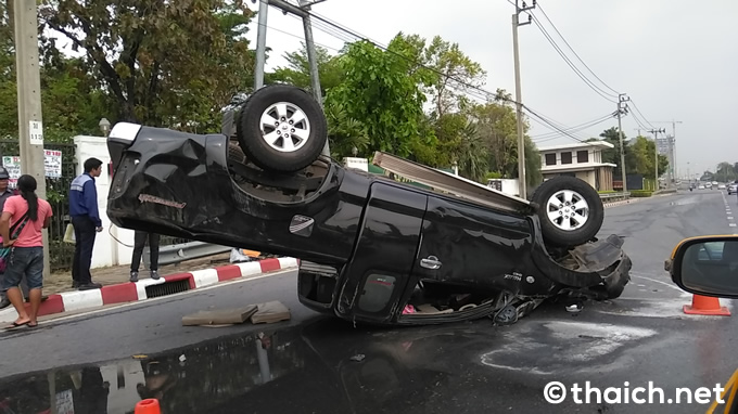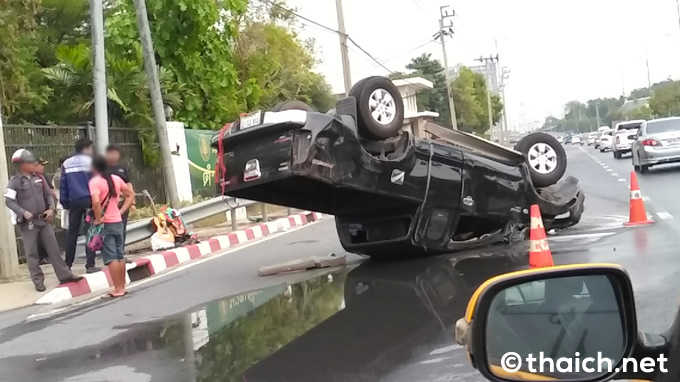 自動車事故の現場に出くわす事が多いバンコクですが、今回の事故はなんとピックアップトラックが横転し、上下が逆さまになってひっくり返っているという大事故現場を見てしまいました。