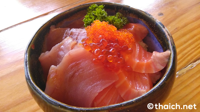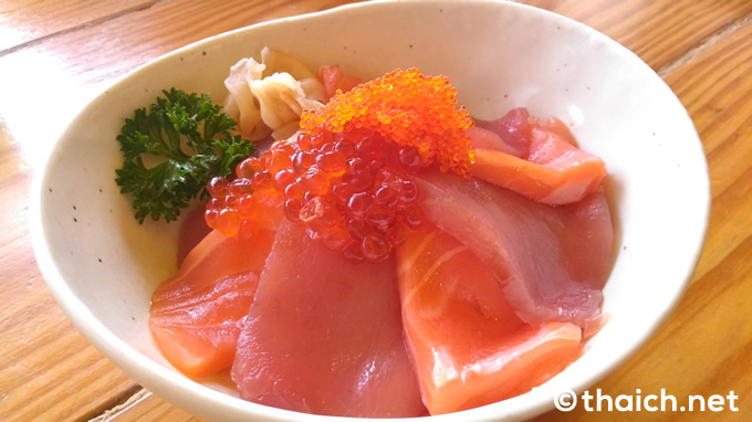 こちらはサーモンにマグロ、イクラにトビッコが乗った「サーモンツナ丼」(280バーツ)。ご飯は少なめで、お刺身は新鮮。