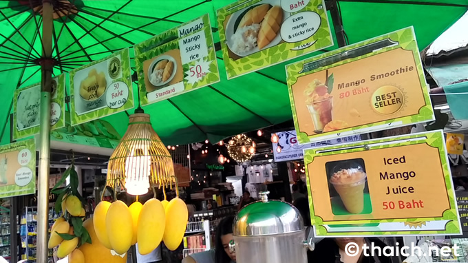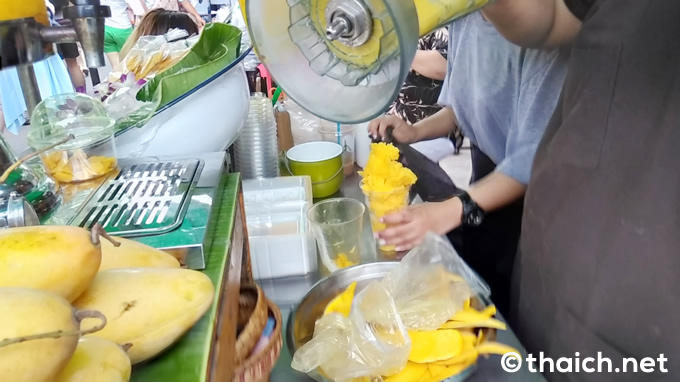 そのままのマンゴーやマンゴージュース、もち米とマンゴーのスイーツ・カイニャオマムアンなどもありますが、一番人気は80バーツのマンゴーシェイクです。