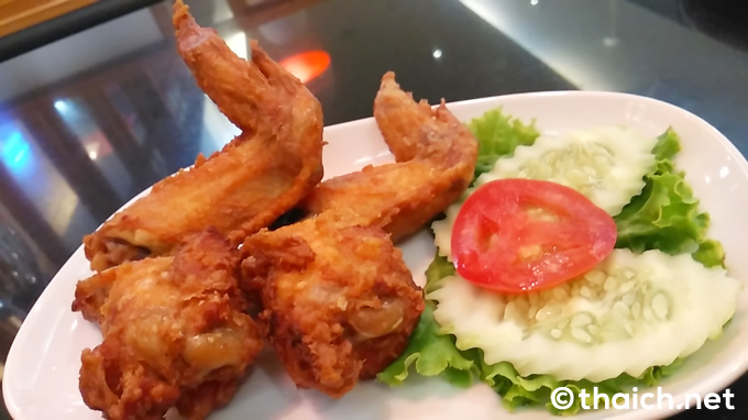 こちらは手羽先の唐揚げ「ピックガイトード(ปีกไก่ทอด)」。価格は二つで74バーツ。揚げたての熱々でジューシーな唐揚げ。お薦めです。