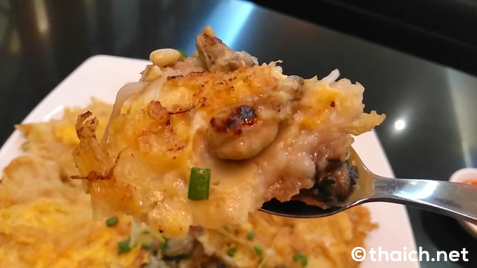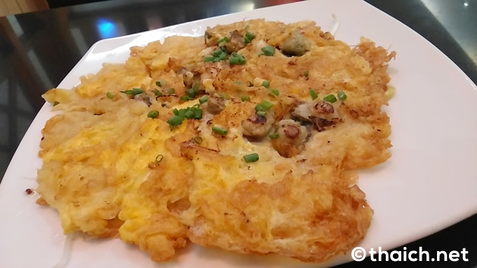 もう一品は「ホーイトード(หอยทอด)」。タイ式の貝入りお好み焼きと言ったところでしょうか。牡蠣とムール貝が選べて、これは牡蠣入りの「ホーイトード」で145バーツです。下にはもやしが敷いてあってボリュームがありますね。