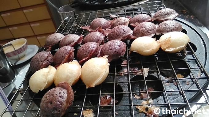 お店を出る時に気づきましたが、店頭でタイ伝統のスイーツを作っていました。これはココナッツミルクから作る「カノムクロック(ขนมครก)」。お腹がいっぱいで買いませんでしたが、とっても美味しそうです。