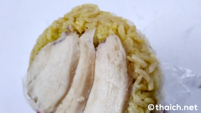 これがカオマンガイのおにぎり。パッケージに「2色ごはんのカオマンガイ」とあるのは、タレの混ざったちょっとだけピリ辛のご飯と、普通のカオマンガイのご飯が半々になっているから。
