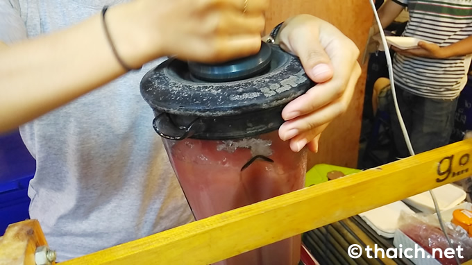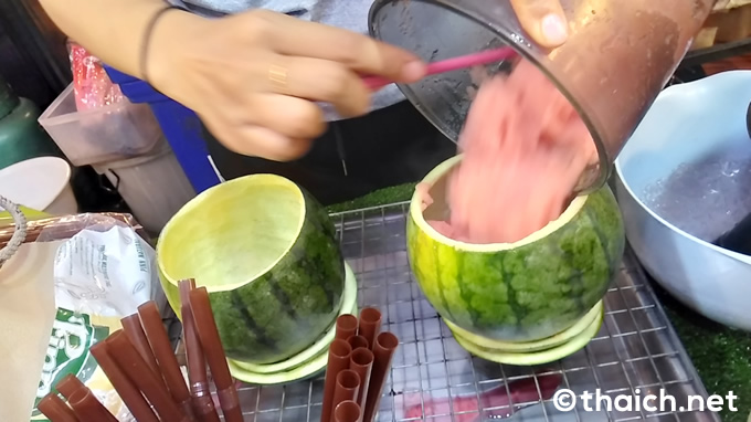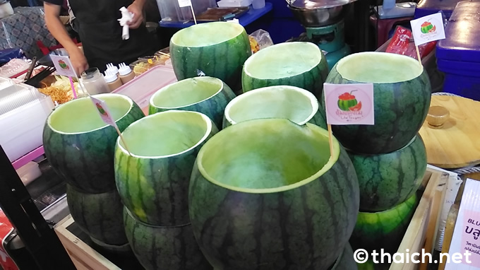 店頭にはスイカの皮の器が並んでいます。他にメロンも店頭に並んでいますが、60バーツの「Watermelon(スイカ)」をオーダー。