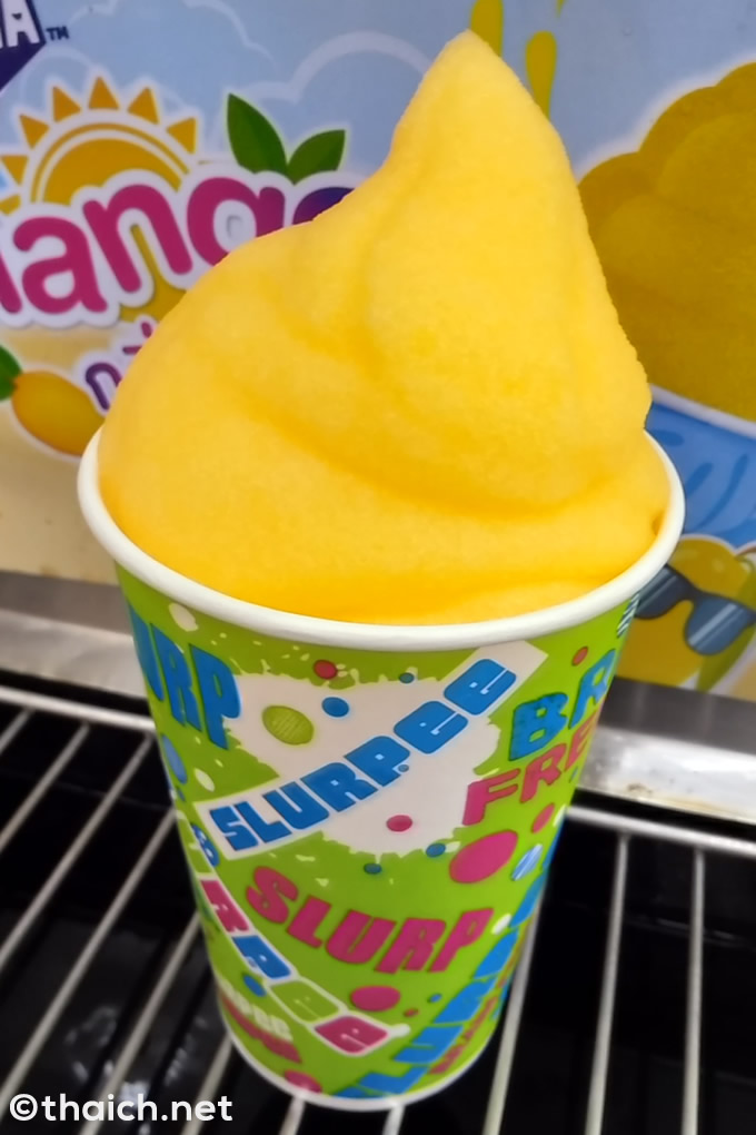 スラーピーは大中小の好きなサイズのカップを選んで好きなだけ自分で入れるシステム。この日は中サイズ19バーツのカップを選んで、新登場のマンゴー味をゲットです。