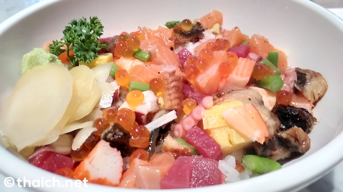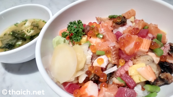 注文したのは「KIN DON(金丼?)」。いわゆる海鮮ちらし丼です。味噌汁が付いて280バーツ。オーダーしたらテーブルで待ち、出来上がりをブザーで知らされるので自分で取りに行きます。フードコートなので、セルフサービスです。