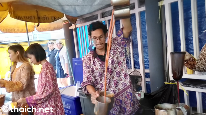 せっかくなら珍しいものを飲みたい。そんな方にオススメなのが「チャーチャック(ชาชัก)」。「チャーチャック」はタイ南部式の練乳タップリのミルクティーで、紅茶と練乳がよく混ざるように、また冷まして飲みやすくするために写真の様に、紅茶を上のカップから下のカップに落下させるのです。