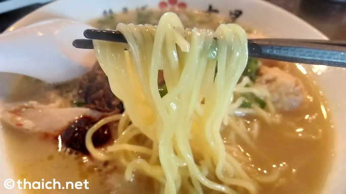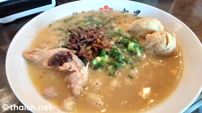 今回オーダーしたのは106バーツの「七星鶏そば」。低価格とは思えない麺によく絡む濃厚スープの鶏白湯ラーメンに、鶏団子などがのったもの。ワサビを付けて食べるのが七星式です。