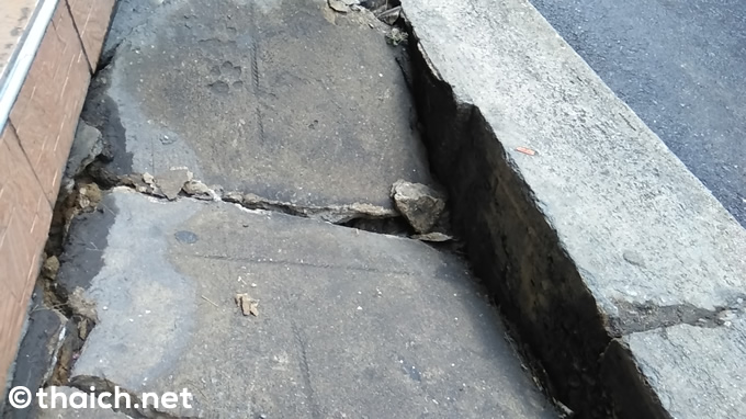 毎日のように歩くバンコク某所の歩道。早朝ご飯を買い行くためそこを通りかかると、なんと陥没しているではありませんか!前日同じ場所を歩いた時はなんともなかったはずなのに・・・。