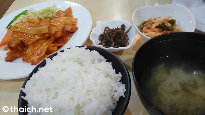 「豚焼き肉セット」は、甘いタレで焼いた豚バラが山盛りと炒めた野菜、ご飯に味噌汁、キムチに、小魚の佃煮のようなもの。味も悪くないです!