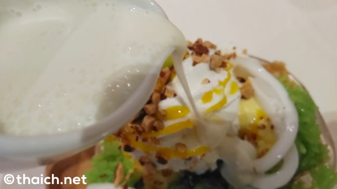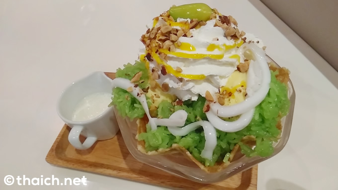 ワッフルの器に、モチ米、マンゴーアイス、生クリームが盛り付けてあり、そこにココナッツミルクをかけていただきますす。モチ米とマンゴーにココナッツミルクをかけて食べる人気のマンゴースウィーツ「カオニャオマムアン(ข้าวเหนียวมะม่วง))」のスタイルですね。