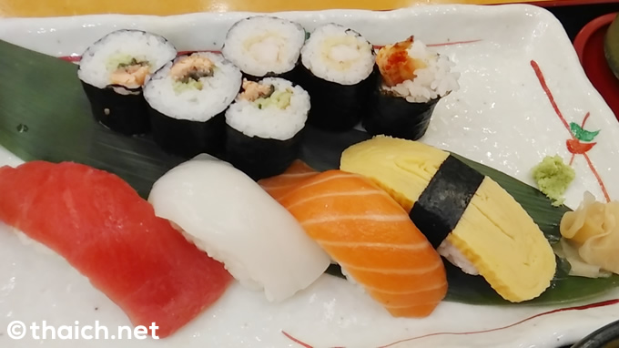 「歌行燈」のランチセットはなかなかお得。今回オーダーしたのが370バーツの「にぎり寿司セット」でこのボリューム。寿司にうどん(またはそばで温かいのと冷たいのが選べます)、茶碗蒸し、サラダが付き、ぜんざいも食後に出てきます。