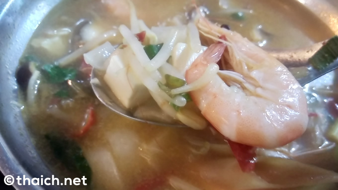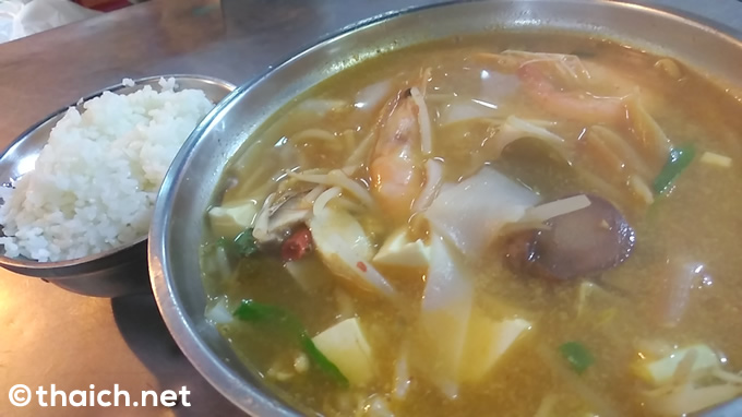こちらが「泰式湯皮粉」です。トムヤムスープかと思ってご飯も一緒に注文したのですが、トムヤムヌードルなんですね。後で調べてわかったことですが、”皮粉”というのは平たいライスヌードルなのだとか。つまりタイで言うセンヤイです。