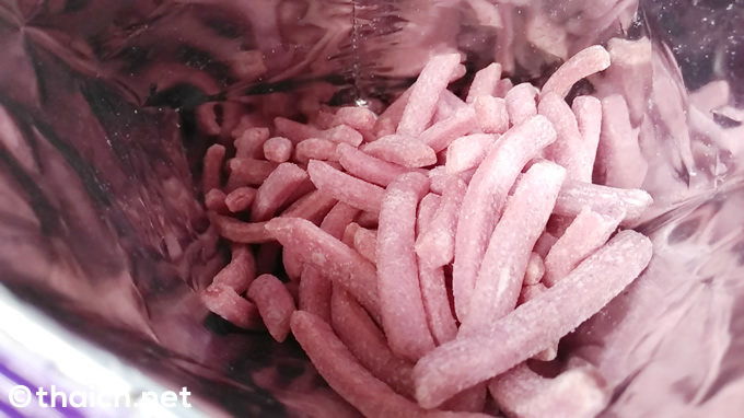 「ジャックス」はスティックタイプのポテトスナック。ケチャップソース付きが一番人気だそうですが、こちらはほんのり甘い日本の紫芋味。サツマイモの紫色の品種ですね。