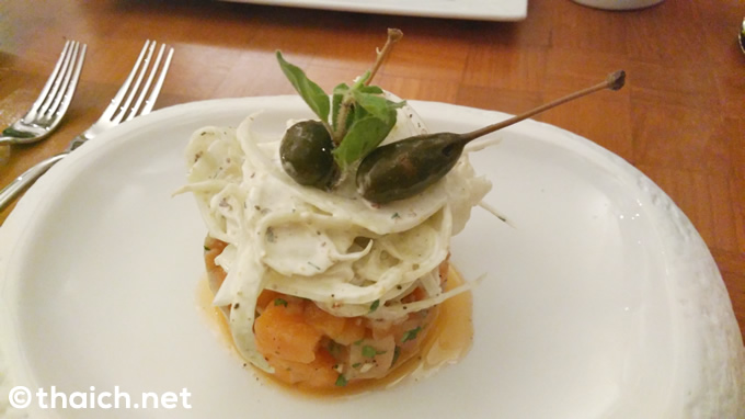 まずは前菜。サーモンをタルタルソースで「lightly spiced salmon tartar celeriac remoulade & caper berries」。