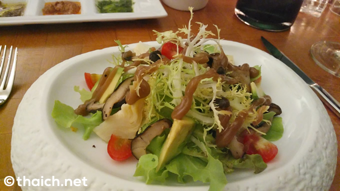 エリンギやアボガドなどのサラダ「grilled eryngii mushroom,avocado,tomato,artichoke & rosemary balsamic vinaigrette」