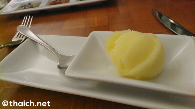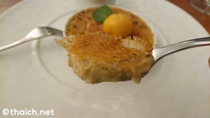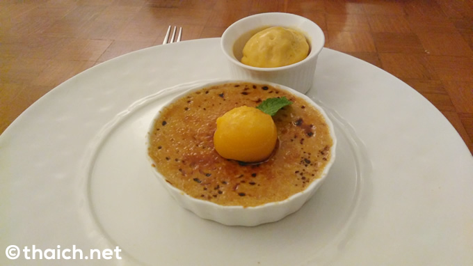 メインは中々のボリュームでしたが、最後のデザートは別腹。「mango creme brulee & fruit sorbet」。