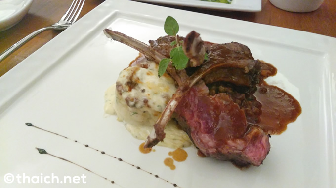 続いてメイン。ラム肉をレアで「lamb rack,market vegetables & dauphinise potatpes」。