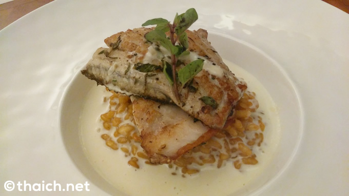 白身魚スナッパーのグリル。フエダイでしょうか。「grilled snapper,fennel risotto,passion fruit & chardonnay beurre blanc」