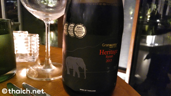 飲み物は、せっかくのタイなので、タイ産の赤ワイン「グランモンテ ヘリテージ シラー(GranMonte Heritage Syrah)」をお願いしました。ボトルだと1,630バーツ、グラスだと410バーツです。