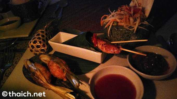 最後の夜ですから、思い切りタイを満喫できるメニューを。タイのウィスキー「メコン」から始まって、タイを訪れたら絶対に食べたい「ソムタム(パパイヤサラダ)」の前菜セット。
