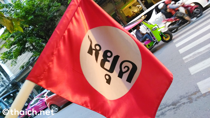 バンコクのスラウォン通りソイ・タンタワンのパクソイ(路地の入り口)のレストラン・バーで食事をしながら道路を眺めていると、赤い旗を持って道路を横断している人たちがいました。
