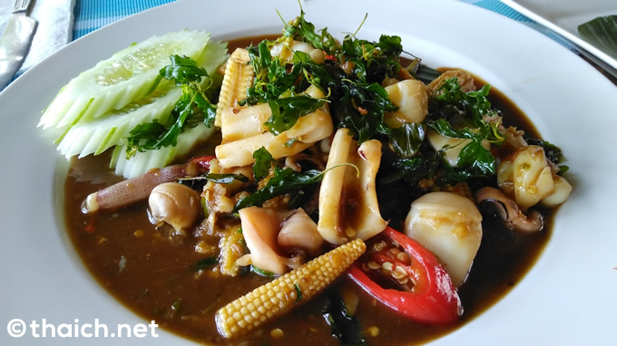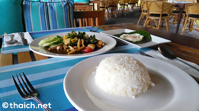 はるばる離島にやってきたのですから、海の幸が食べたい。ということでメニューも見ずに、イカのガパオライス「カオパットガパオプラームック(ข้าวผัดกระเพราปลาหมึก)」をオーダーしました。ガパオライスとは最近は日本でも人気でご存知の方も多いと思いますが、ガパオというハーブと肉やシーフードをオイスターソースで炒めて、ご飯に添えたものです。