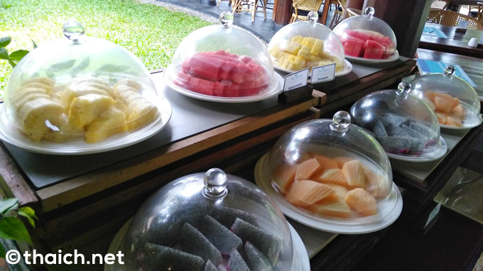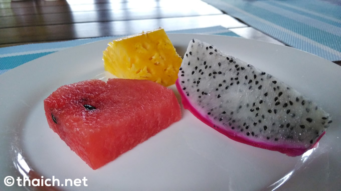 タイヌードルでお腹はいっぱいでしたが、せっかくなので最後にフルーツを一切れづつ。おなじみのスイカ、パイナップル、そして白い果肉は日本では食べる機会の少ないドラゴンフルーツです。