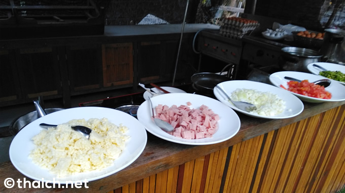 ホテルの朝食は卵を焼いてもらえるのが嬉しいですね。卵コーナーのカウンターに並ぶのはオムレツの具材です。