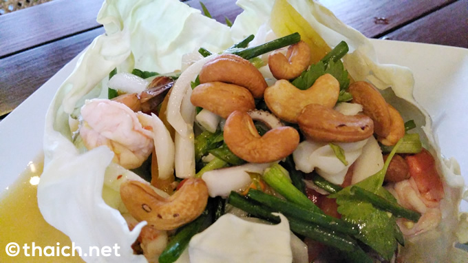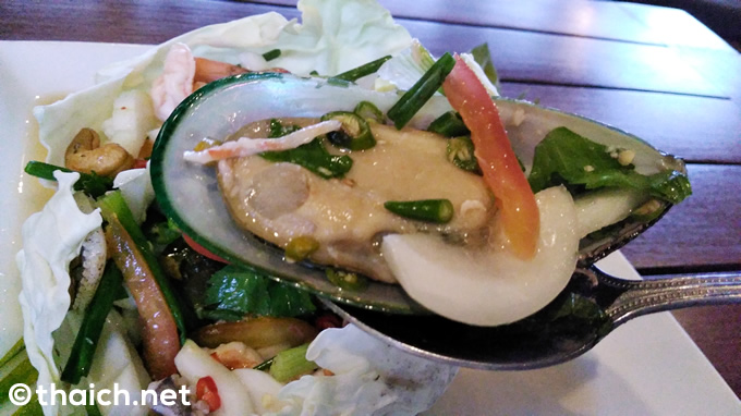 こちらはミックスシーフードの和え物「ヤムルアムミットタレー(Yum Ruam Mit Talay,ยำรวมมิตรทะเล)」(300バーツ)。海老やイカやムール貝などが、酸味のあるソースで野菜と和えてあります。ビールにピッタリですね。