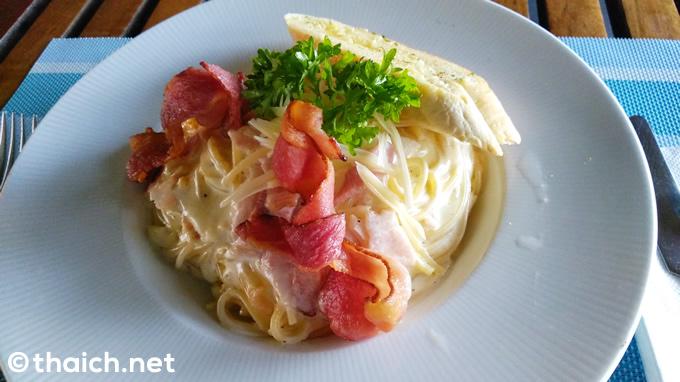 別の日に食べた超濃厚な「カルボナーラ」(220バーツ)。この時は併設のホテル「ハーティエン ビーチ リゾート」側にあるレストラン「inSea BAR & GRILL」にいたのですが、「CAPRI」のメニューもオーダー可能でした。